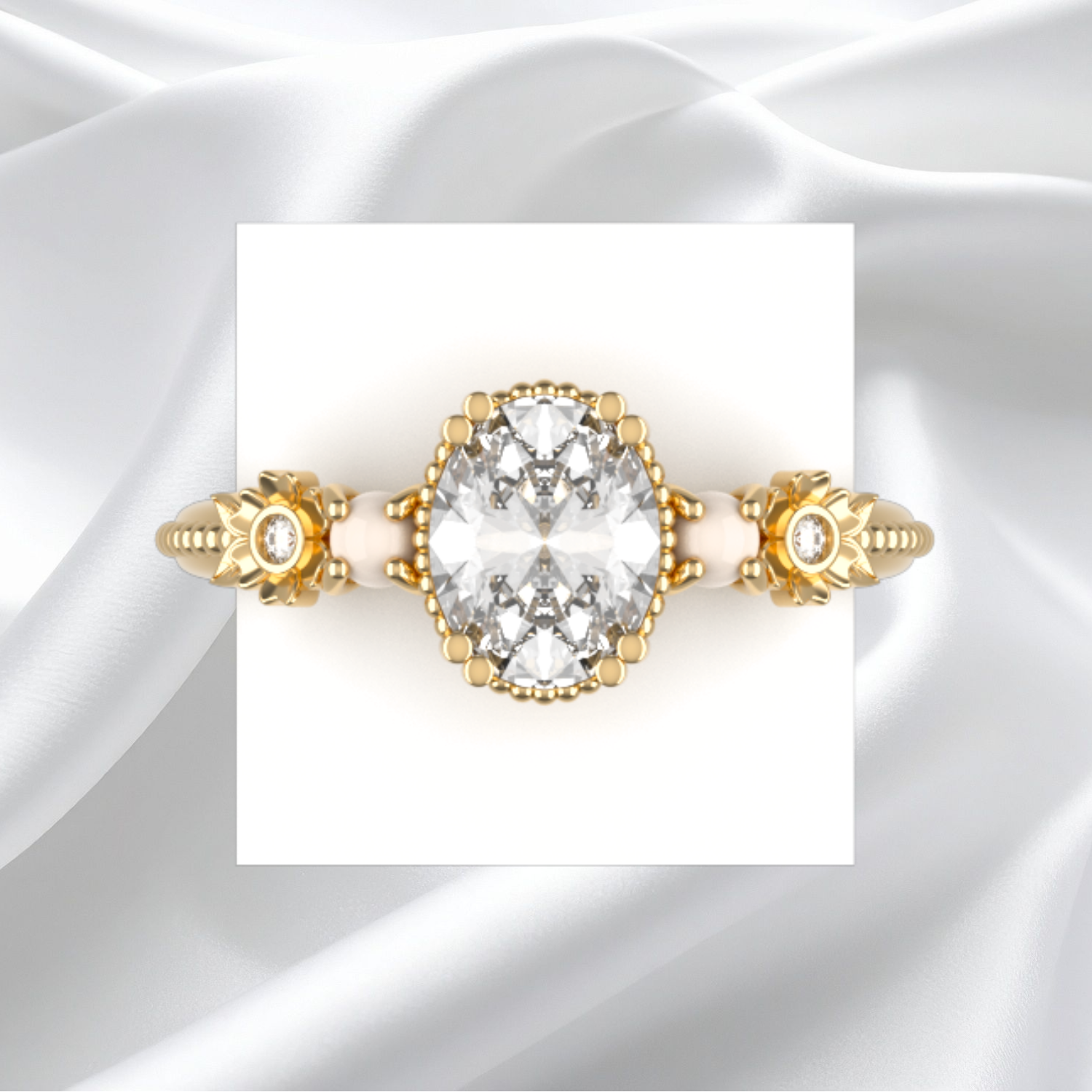 The centre stone, available in Moissanite, Lab-Grown, or Natural Diamond, is framed by delicate gold beading and floral accents reminiscent of the Bridgerton style.
